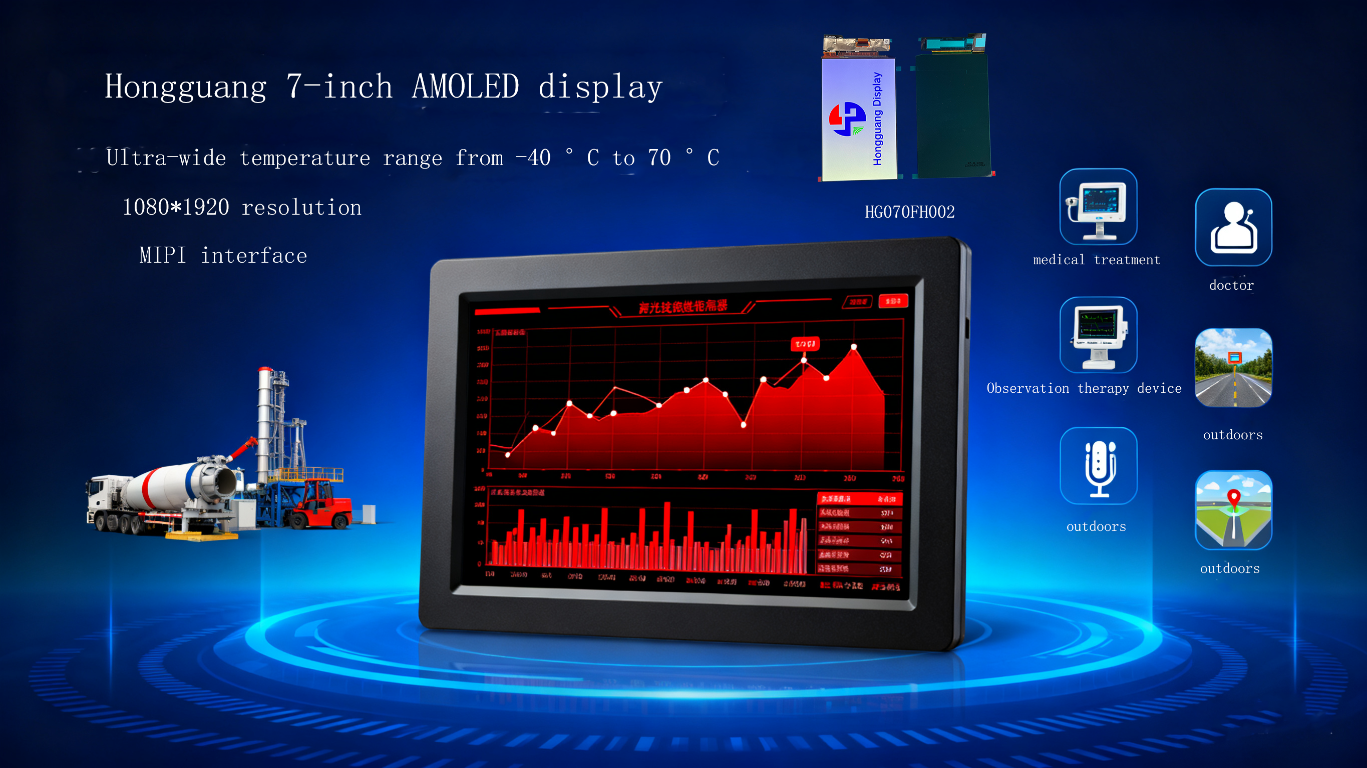 In environments where temperatures swing from -40°C to 70°C, most displays struggle to perform. The Hongguang 7-inch AMOLED display is engineered to deliver consistent, vivid visuals even in the harshest conditions. With a 1080×1920 resolution and MIPI interface, it combines high-end display technology with rugged reliability.