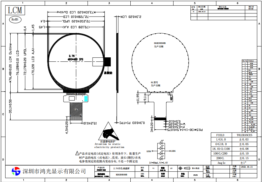 HG028HS005 | 2.76 inch TFT LCD | MIPI | IPS | Round Display 480x480 | Security Display| 700cd/m2 Brightness|